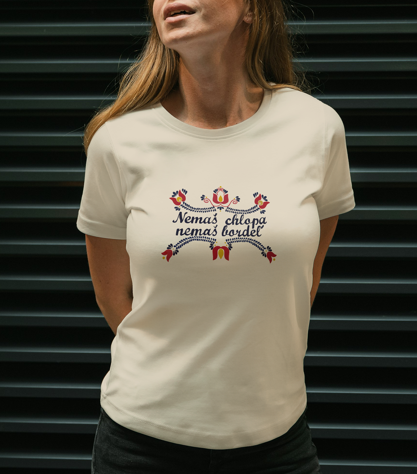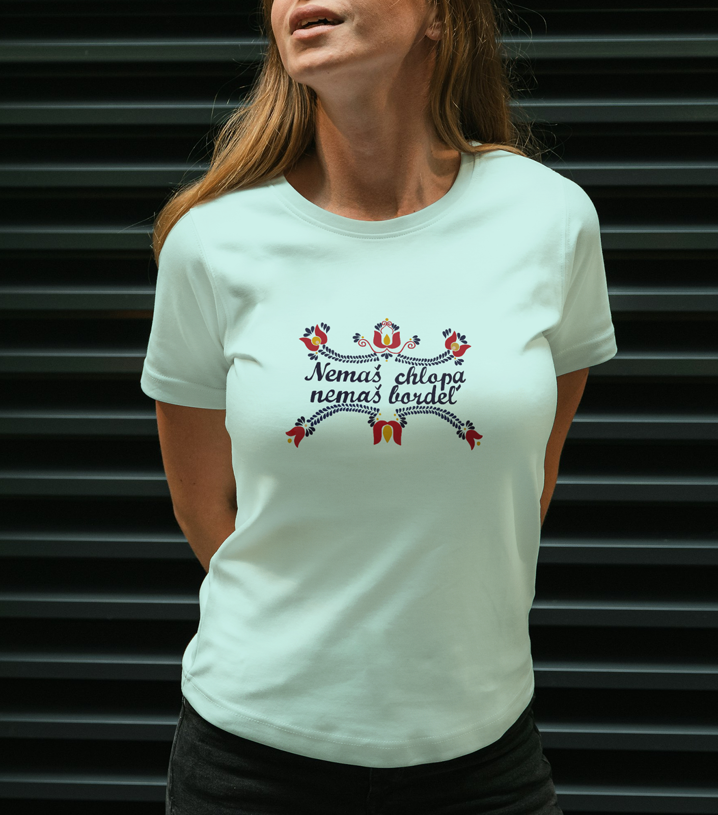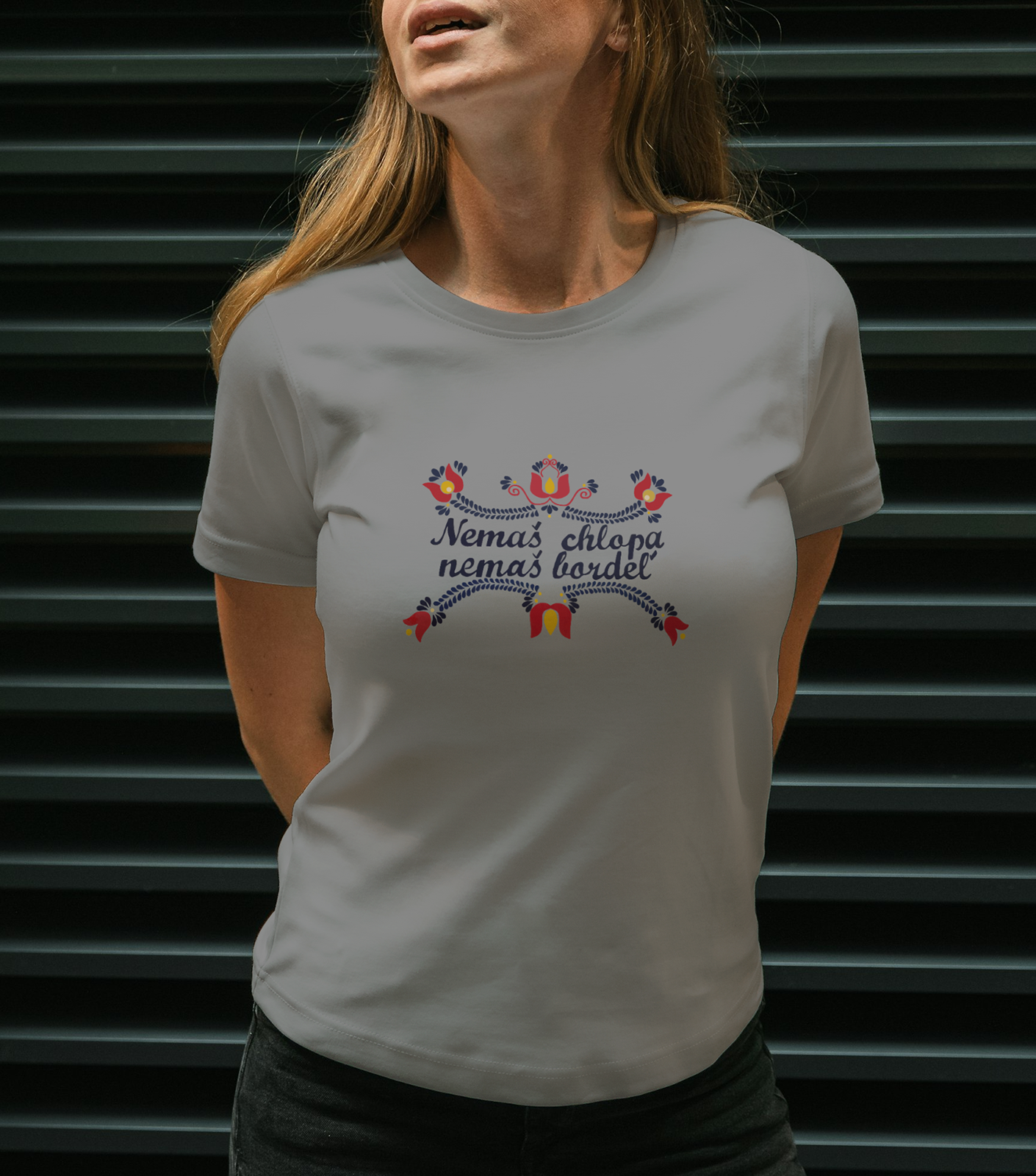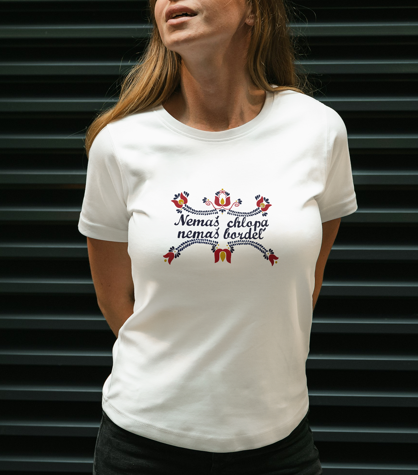 Dámske tričko s potlačou „Nemáš chlopa, nemáš bordel“ – folklórny motív.