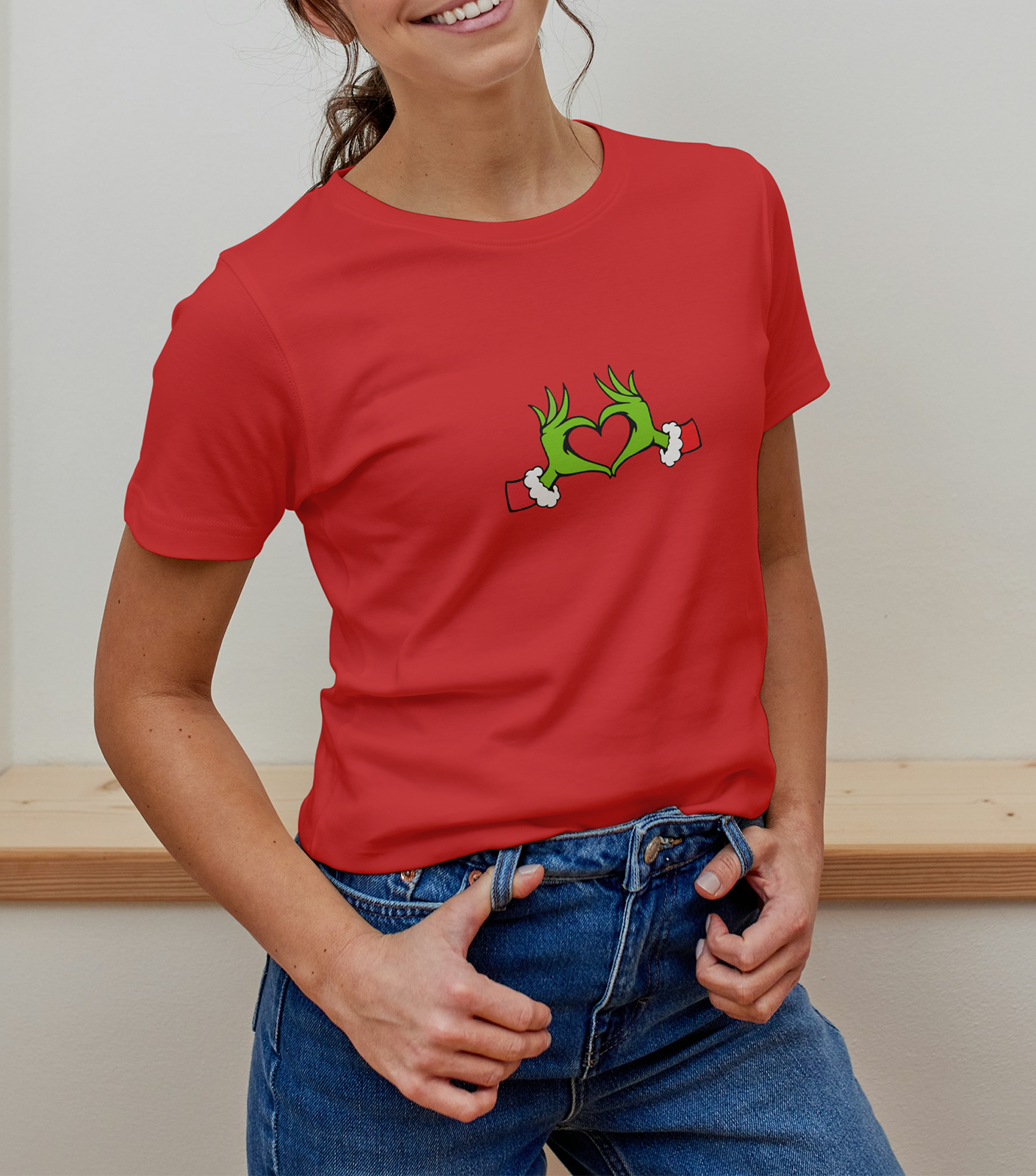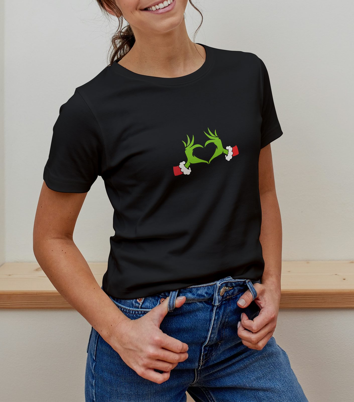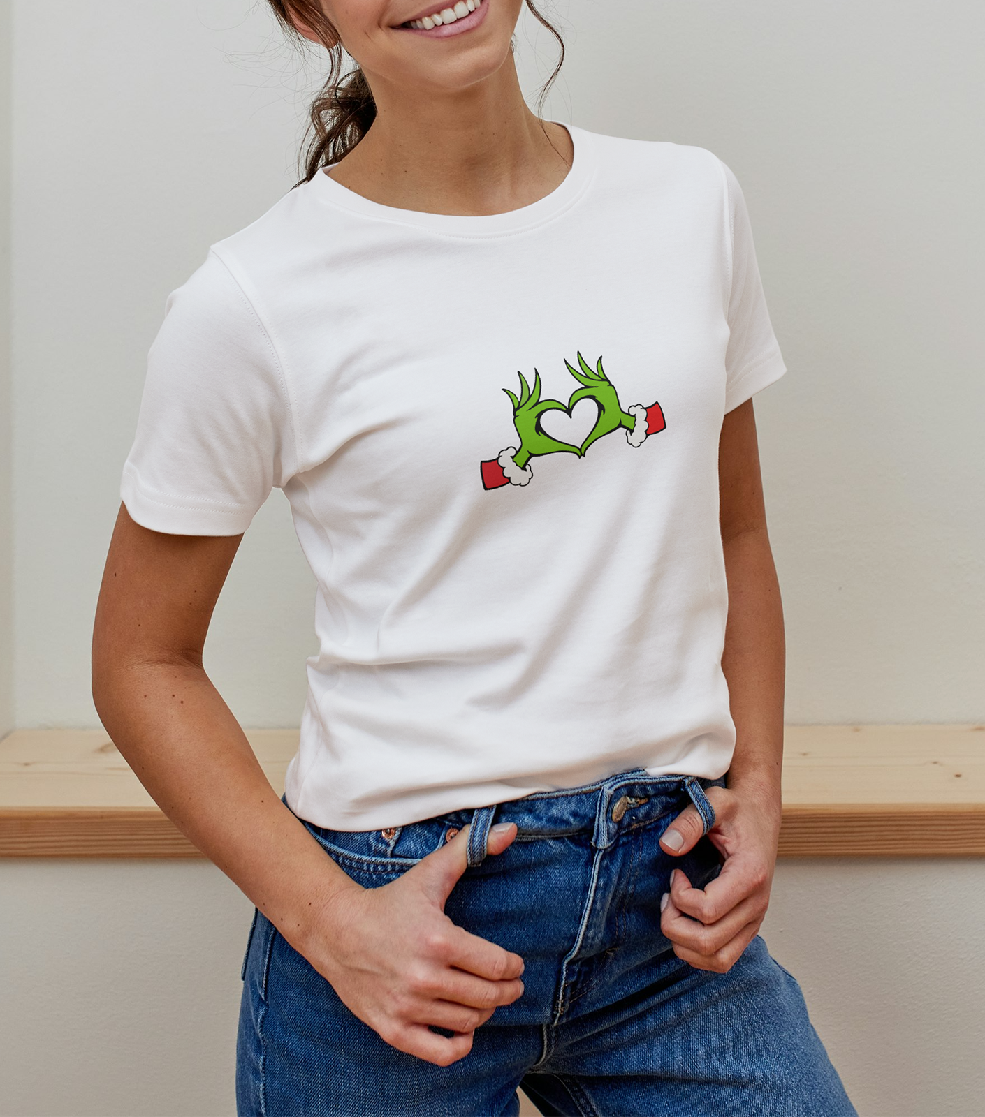 Toto dámske vianočné tričko je určené pre ženy, ktoré milujú humor a chcú na Vianoce zažiariť originálnym outfitom. Potlač so zelenými rukami Grincha, ktoré sú v tvare srdiečka, okamžite pritiahne pozornosť a vyčarí úsmev každému v okolí.