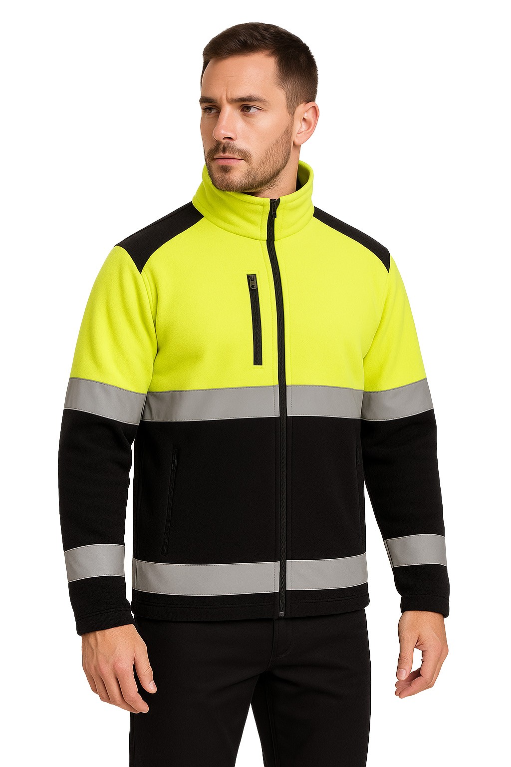 Dvojfarebná výstražná flísová mikina navrhnutá pre profesionálov, ktorí potrebujú vysokú viditeľnosť a komfort pri práci v náročných podmienkach. Tento model kombinuje žiarivú žltú farbu s čiernymi prvkami, čo zaručuje vynikajúcu viditeľnosť za denného aj nočného osvetlenia.
