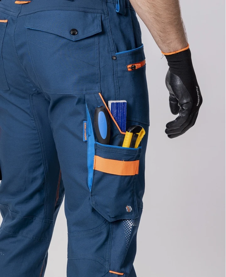 Pracovné monterkové nohavice s náprsenkou ARDON CREATRON sú navrhnuté pre profesionálov aj hobby používateľov, ktorí potrebujú odolné, pohodlné a funkčné pracovné nohavice s trakmi. Vďaka špeciálnemu strečovému bavlnenému materiálu Amalytton® ponúkajú vysokú pevnosť, nízku hmotnosť a príjemný pocit pri nosení aj počas dlhého pracovného dňa. Na exponovaných miestach sú vsadené extra odolné a štvorsmerne elastické diely Tabiflex®, ktoré zvyšujú flexibilitu pri pohybe a zaisťujú dlhú životnosť odevu. Ergonomický 3D SLIM FIT strih podporuje voľnosť pohybu bez obmedzenia pohodlia. Spevnené kolená z materiálu Oxford s vodoodpudivou úpravou a vnútornými vreckami pre nákolenníky zabezpečujú ochranu pri práci v náročných polohách. Nohavice majú nastaviteľné elastické traky, ktoré umožňujú jednoduché prispôsobenie výšky a komfortu nosenia, a technológiu ADN®AdaptBelt, ktorá zabezpečuje plynulé prispôsobenie pása pri každom pohybe bez pocitu obmedzenia. Praktické množstvo nárazových a nástrojových vreciek poskytuje dostatok úložného priestoru pre náradie a drobnosti. Spodný lem nohavíc je vystužený materiálom Oxford, čo zvyšuje odolnosť proti oderu a opotrebovaniu. Dynamické reflexné 3D potlače a hi‑vis doplnky zvyšujú vašu viditeľnosť pri slabom svetle. Dĺžku nohavíc je možné jednoducho predĺžiť o 5 cm pre lepšie prispôsobenie výške.
