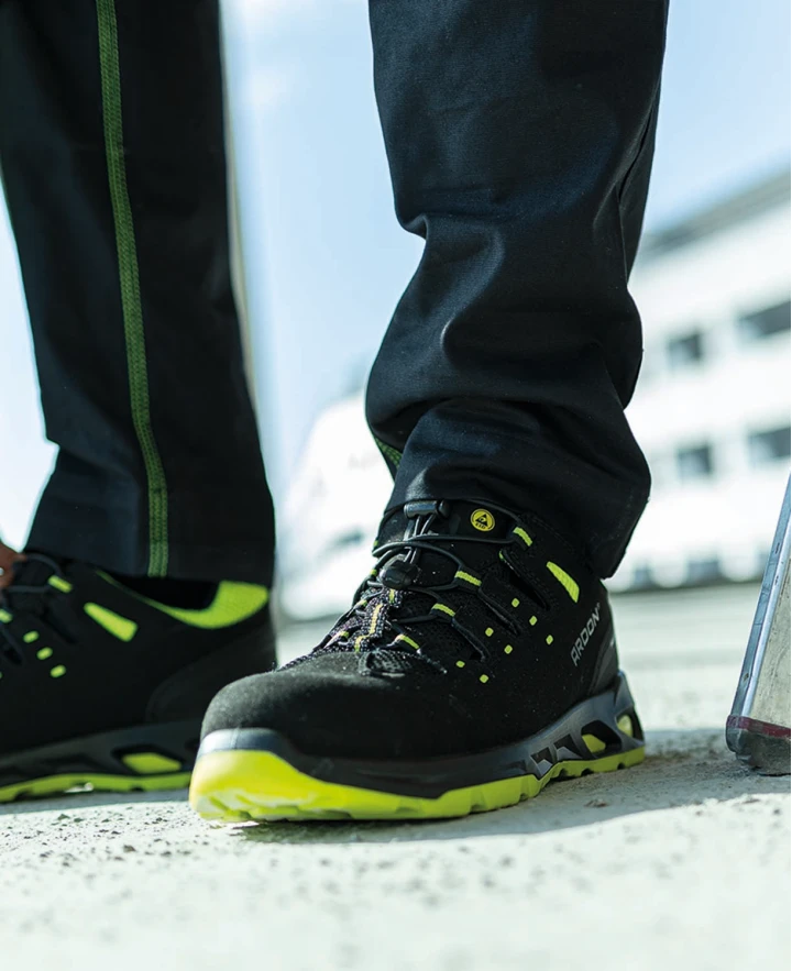 Bezpečnosť je zabezpečená kompozitnou tužinkou a kevlarovou planžetou proti prepichnutiu, vďaka čomu obuv neobsahuje kovové prvky. Dvojzložková PU/PU podrážka je antistatická, olejivzdorná a protišmyková (SR), čím zvyšuje stabilitu na rôznych povrchoch.
