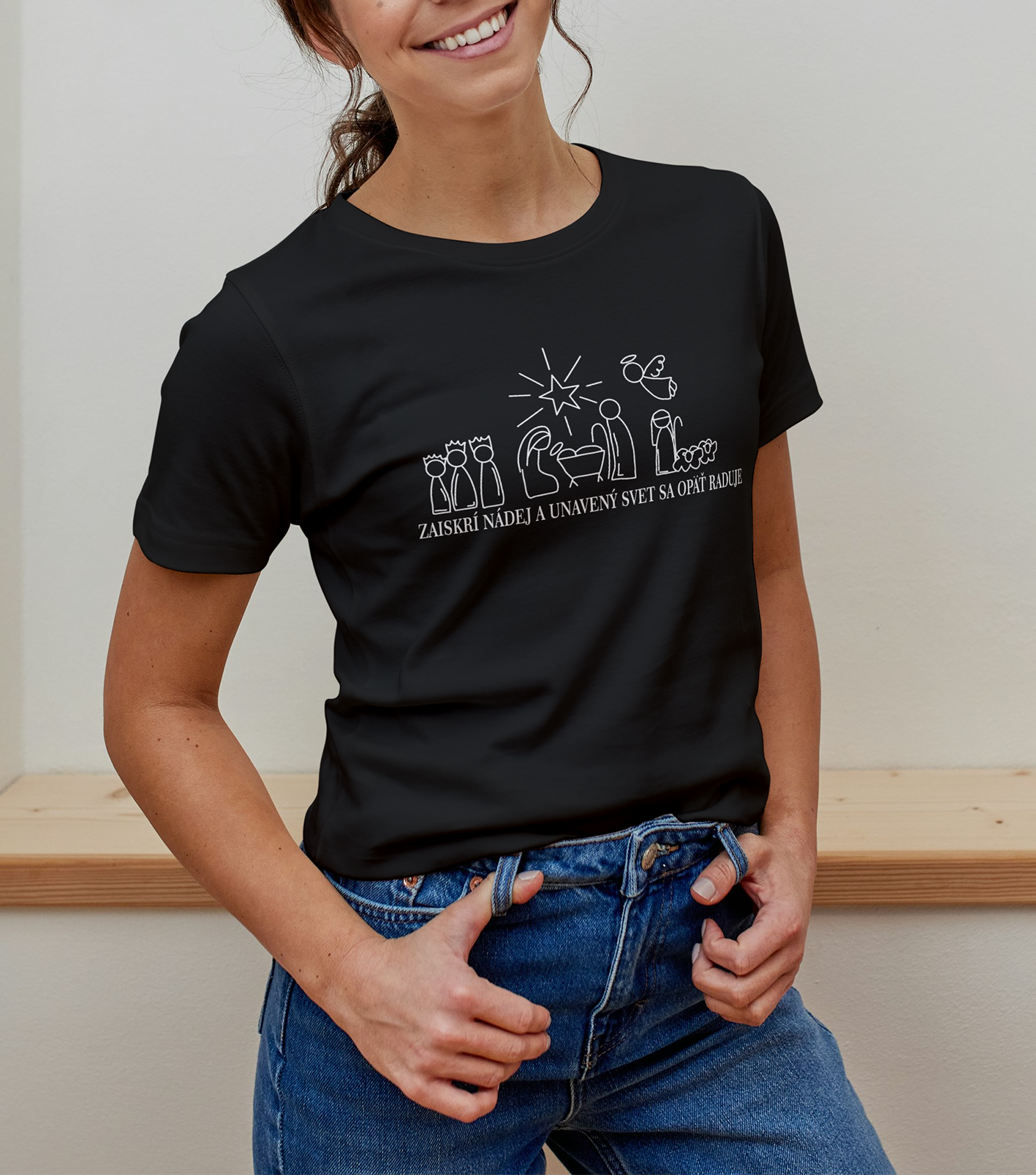 Dánske vianočné tričko prináša spojenie jednoduchosti, symboliky a sviatočnej atmosféry. Dizajn zobrazuje minimalistický betlehem – Mária, Jozef, Ježiško v jasličkách, traja králi, pastieri a nad nimi žiariaca hviezda. Všetko vo forme jemnej jednolínie, ktorá pôsobí moderne a štýlovo.