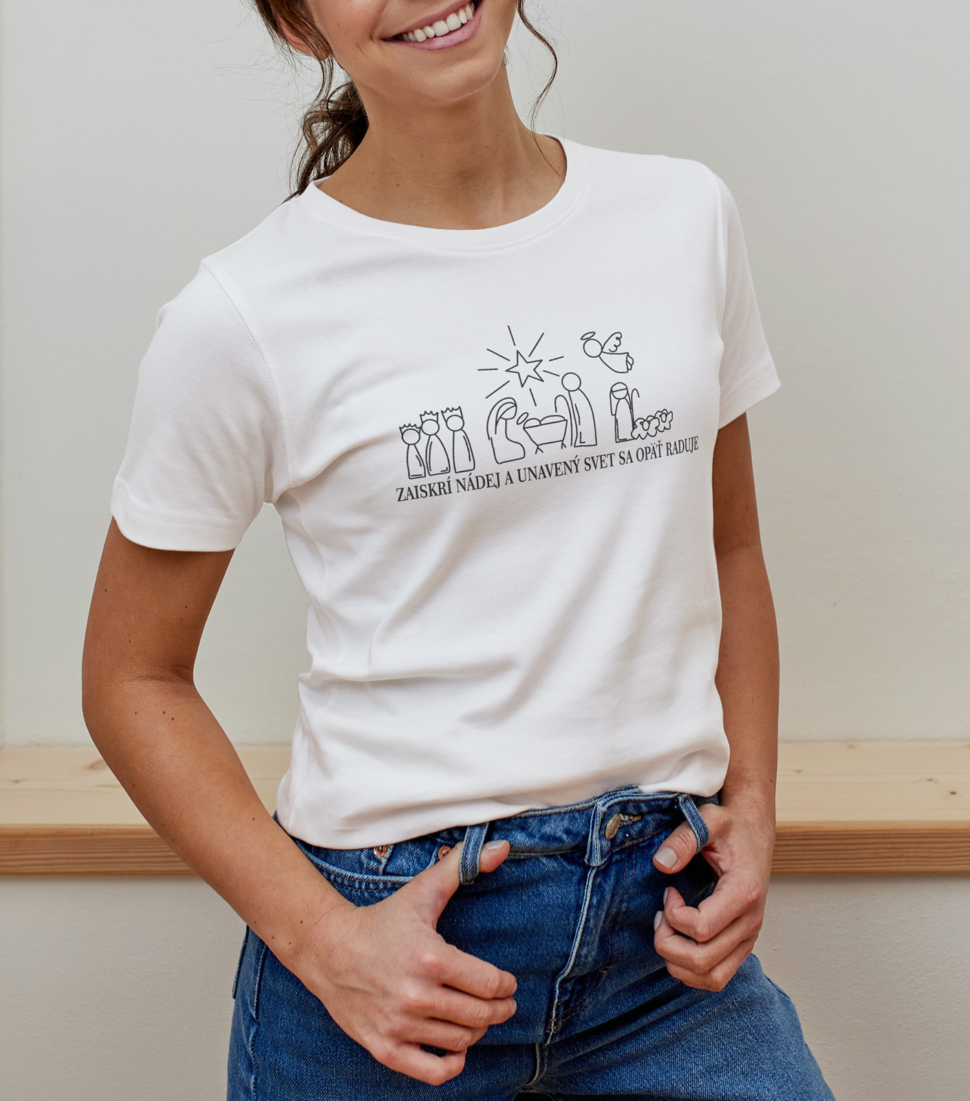 Pod grafikou sa nachádza text „Zaiskrí nádej a unavený svet sa opäť raduje“, ktorý tričku dodáva duchovný a hlboký vianočný odkaz.Tričko je vyrobené z kvalitného, príjemného a odolného materiálu. Vďaka pohodlnému strihu sa hodí na bežné nosenie, vianočné večierky, rodinné oslavy či ako kreatívny darček.